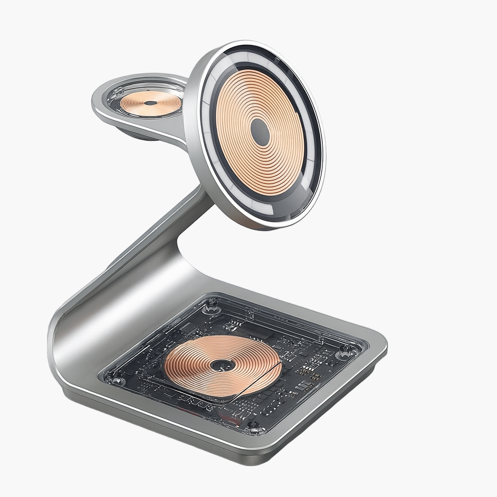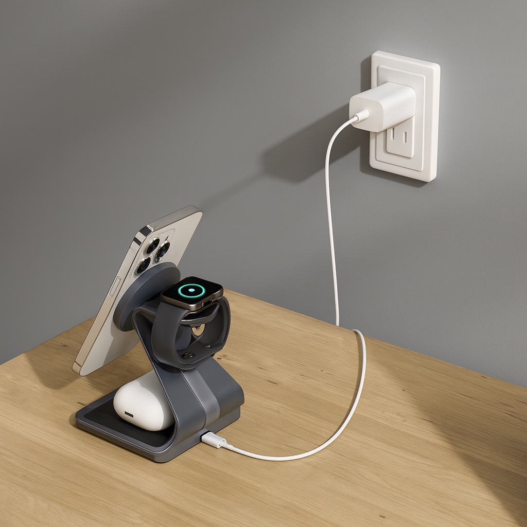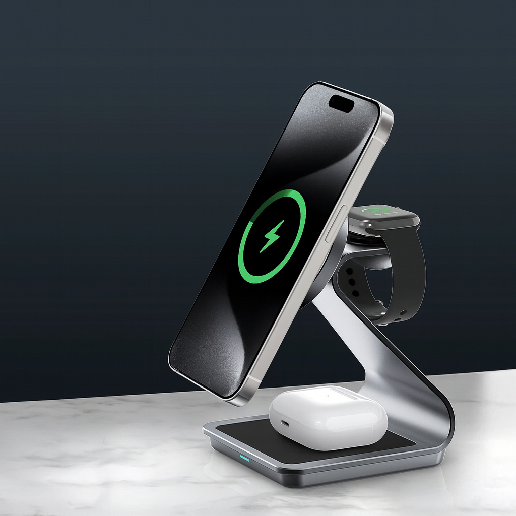 Erweitern Sie Ihr Setup mit TriDock – einem hochwertigen 3-in-1-MagSafe-Ladegerät für iPhone, Apple Watch, AirPods und alle Qi-fähigen Geräte. Hergestellt aus Aluminiumlegierung und ABS, bietet es schnelles kabelloses Laden mit 15 W in einem schlanken, platzsparenden Design, das für Ordnung auf Ihrem Schreibtisch oder Nachttisch sorgt.