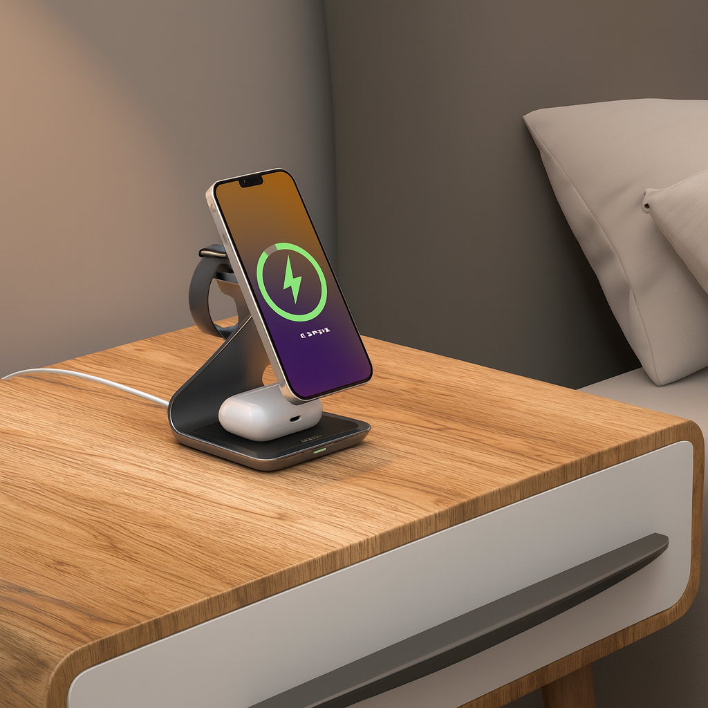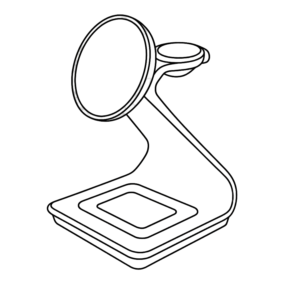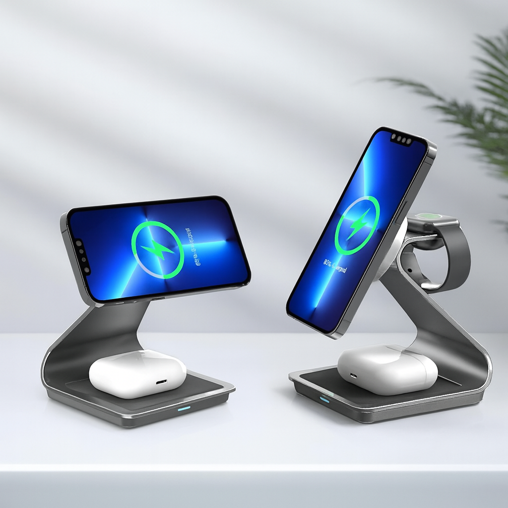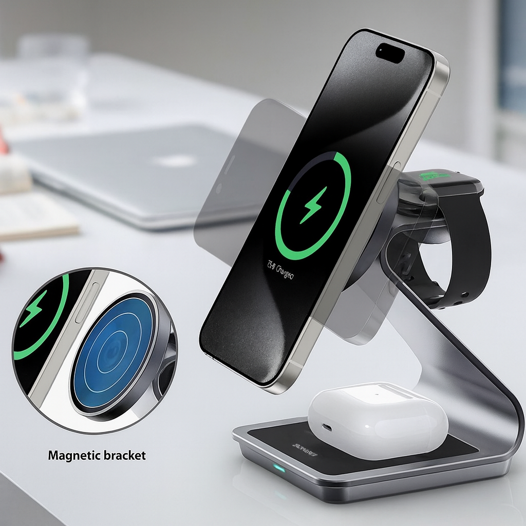 Erweitern Sie Ihr Setup mit TriDock – einem hochwertigen 3-in-1-MagSafe-Ladegerät für iPhone, Apple Watch, AirPods und alle Qi-fähigen Geräte. Hergestellt aus Aluminiumlegierung und ABS, bietet es schnelles kabelloses Laden mit 15 W in einem schlanken, platzsparenden Design, das für Ordnung auf Ihrem Schreibtisch oder Nachttisch sorgt.