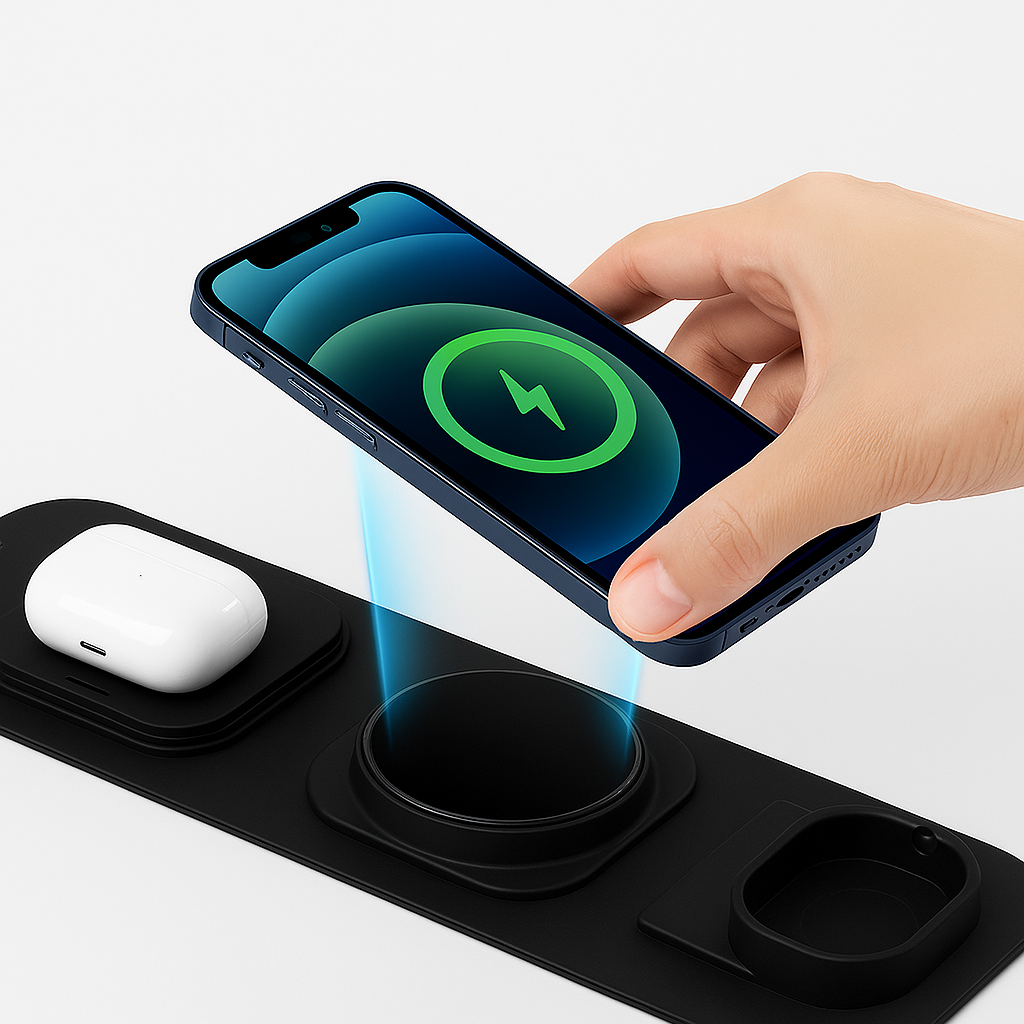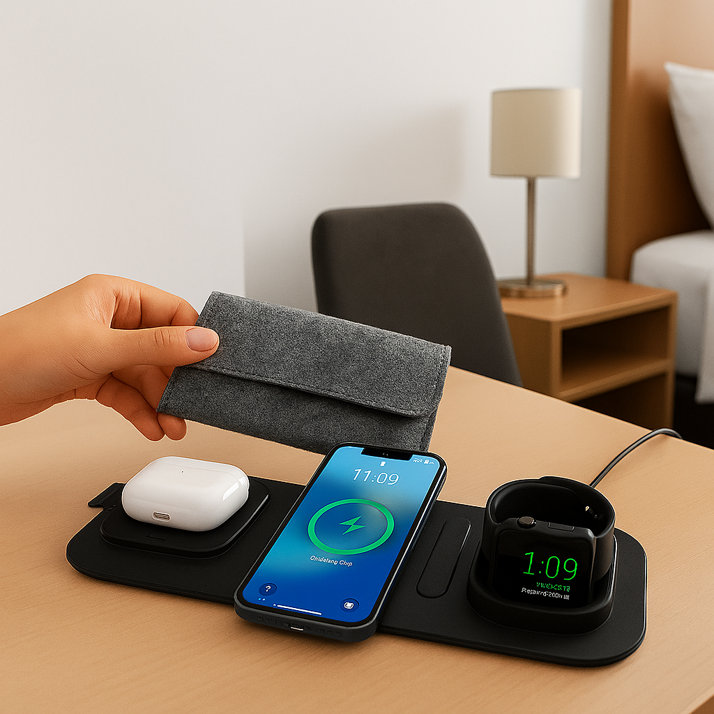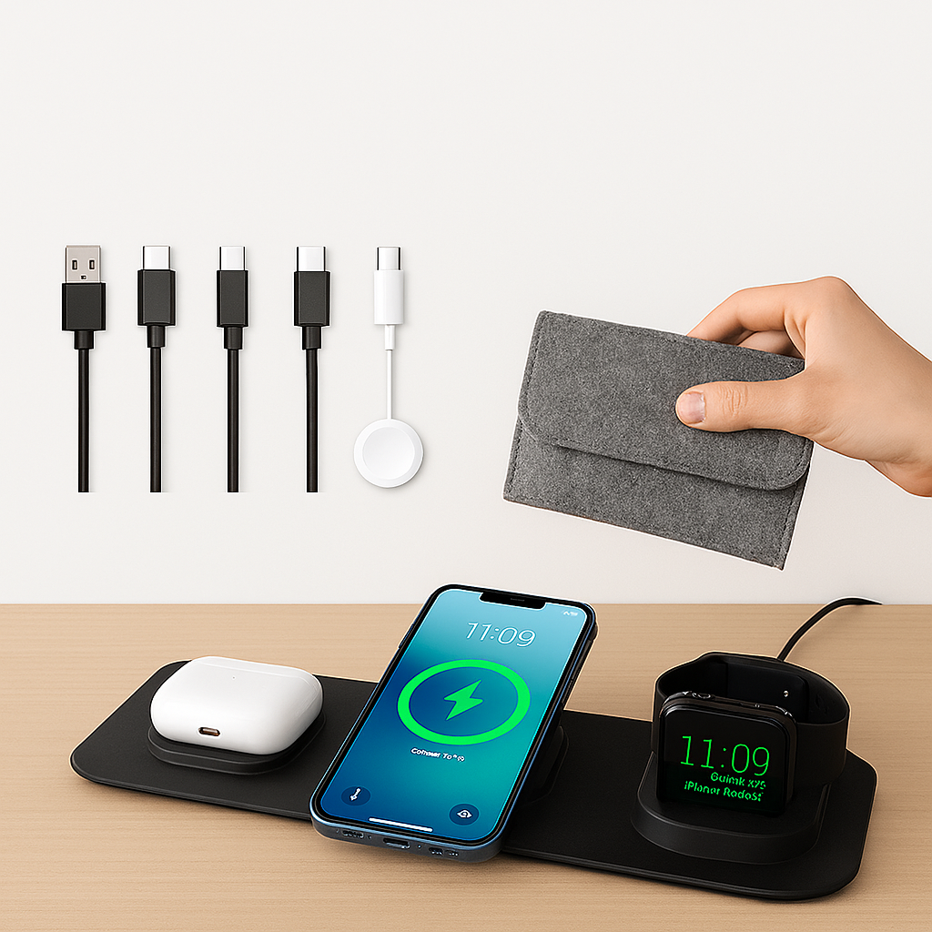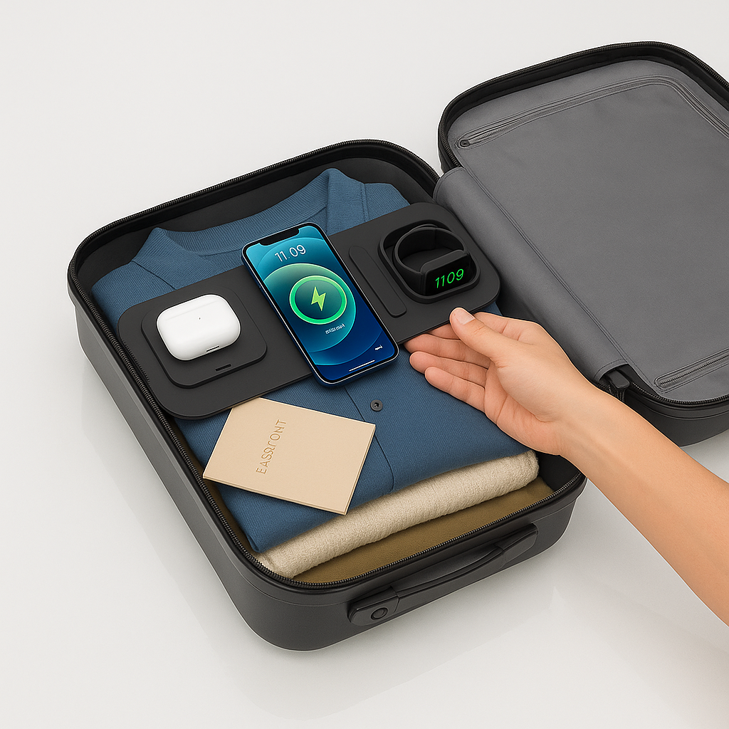 Mit dieser tragbaren 3-in-1-Ladestation können Sie Ihre wichtigsten Geräte – Telefon, Uhr und Ohrhörer – überall aufladen. Kompakt genug, um bequem in Ihren Koffer zu passen, ist sie der perfekte Reisebegleiter, um auch unterwegs in Verbindung zu bleiben.