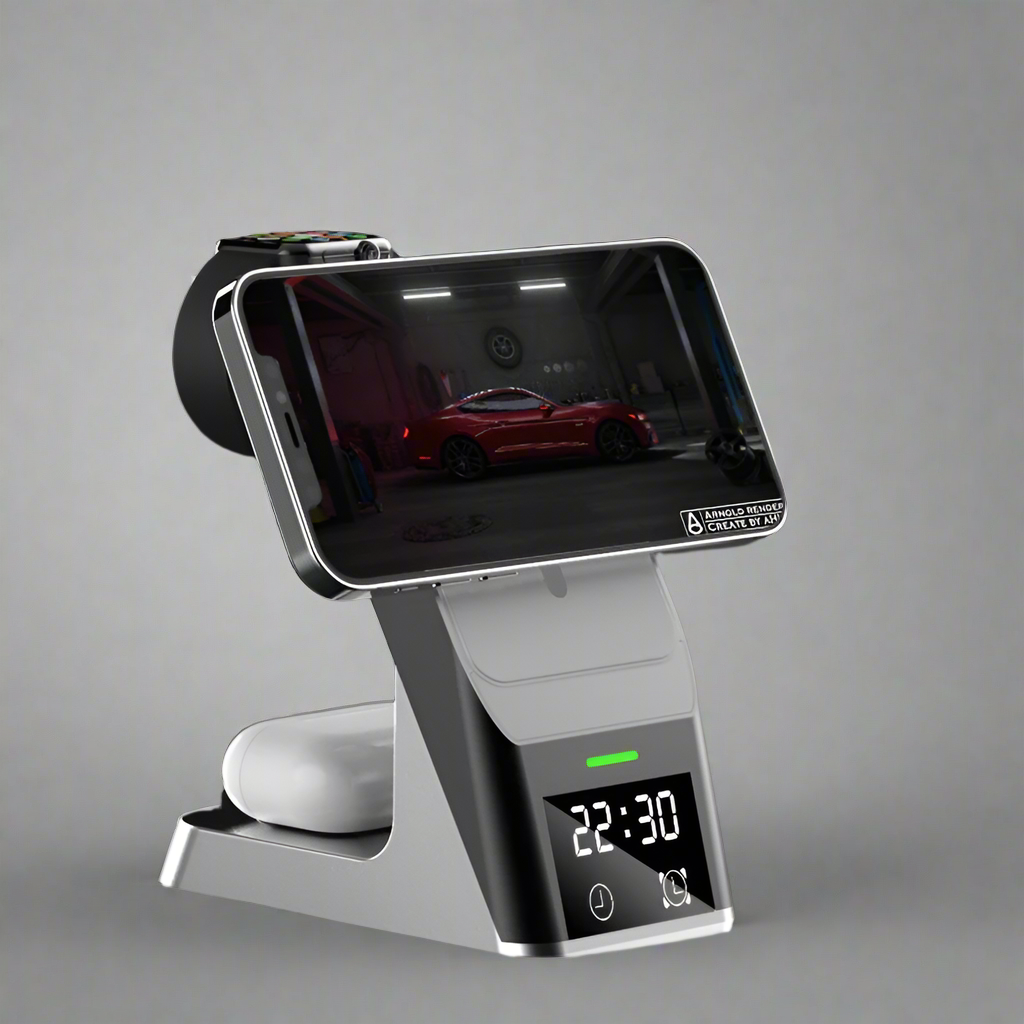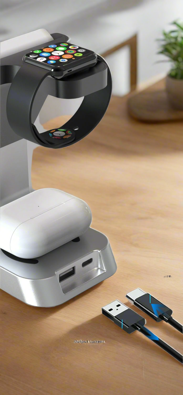 Diese kabellose Ladestation lädt bis zu drei Geräte nahtlos auf und unterstützt Qi-fähige Smartphones (bis zu 15 W), Smartwatches und kabellose Ohrhörer. Sie ist kompatibel mit Apple, Samsung, Google, Huawei und den meisten Qi-zertifizierten Geräten. Zusätzlich verfügt sie über USB-Anschlüsse zum kabelgebundenen Laden von Zubehör.