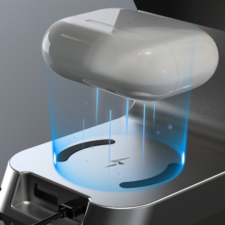 Das kabellose Ladepad bietet bis zu 15 W Schnellladeleistung für Smartphones. Smartwatches und Ohrhörer werden in der Regel mit 3 W geladen, während zusätzliche USB-Anschlüsse bis zu 10 W für kabelgebundenes Zubehör unterstützen. Alle Geräte können gleichzeitig geladen werden.